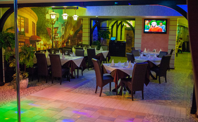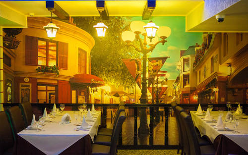 Увеличивают пространство так называемые «золотые окна», украшающие стены заведения. Это очень правдоподобные имитации оконных рам домиков.